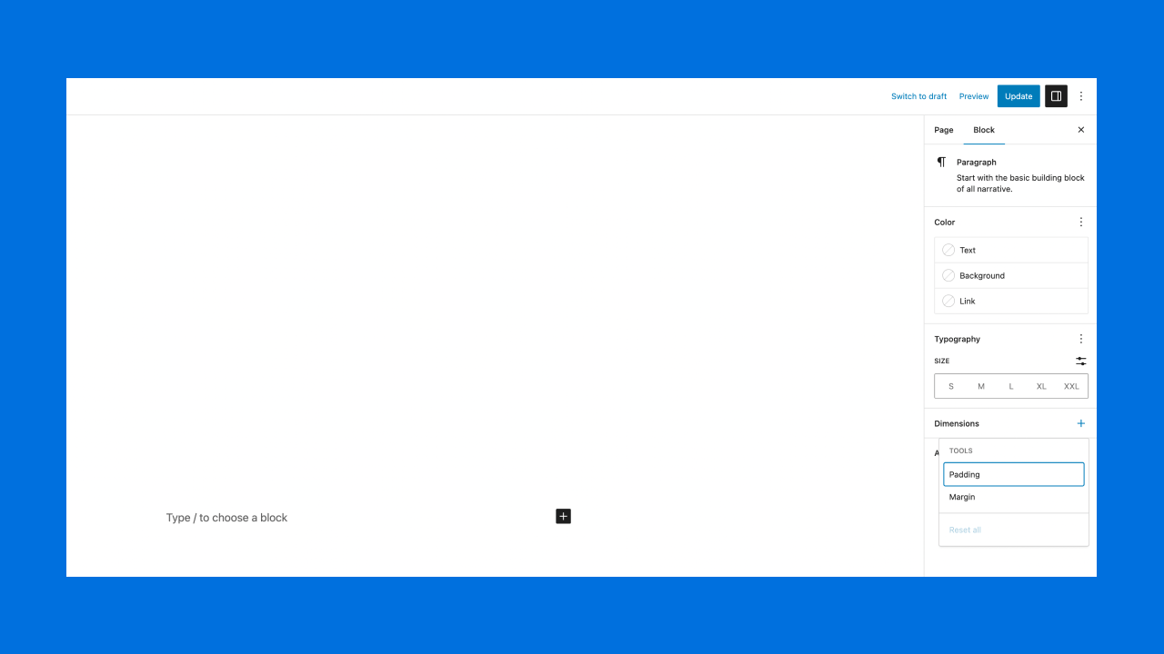 So, imagine this scenario: you want to limit the dimension settings (both padding and margin) for blocks used specifically on pages. Administrators should have the power to modify dimensions, while other users should not.