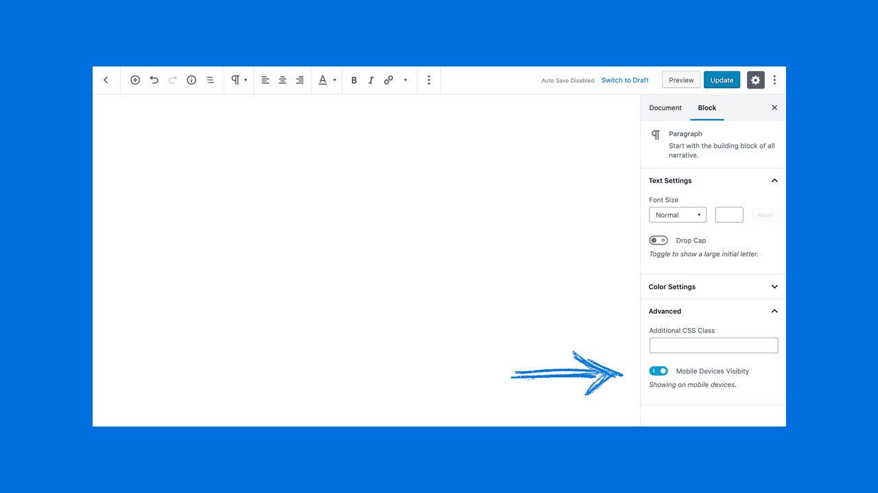 Almost done! All I need to do now is apply our mobile-hidden to the block. I just need to make sure that it will only be added when toggle is off.